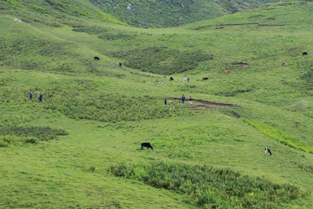 The trail gradually opens into vast alpine meadows as trekkers approach the beautiful Dayara Bugyal. The expansive grasslands stretch across rolling hills and provide breathtaking panoramic views of the Himalayan ranges.