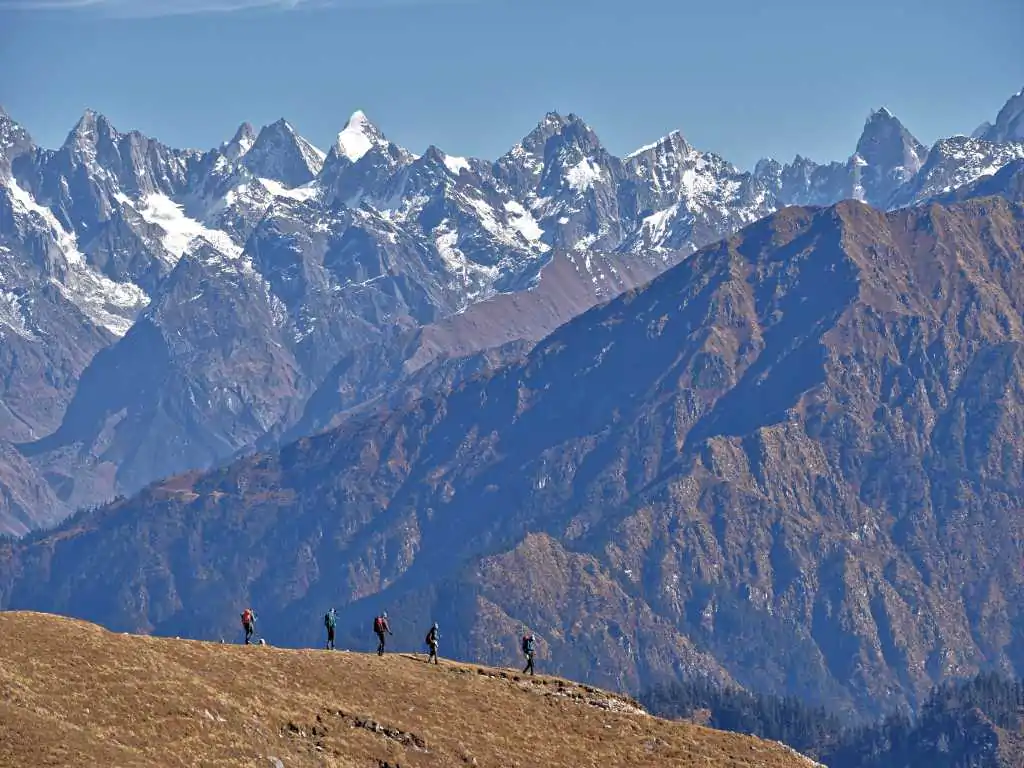The trail passes through dense forests of pine and oak, charming Himalayan villages, and vast alpine meadows before reaching the breathtaking ridge section. As trekkers ascend higher, they are rewarded with magnificent views of prominent Himalayan peaks including Swargarohini, Bandarpoonch, and Black Peak (Kalanag).